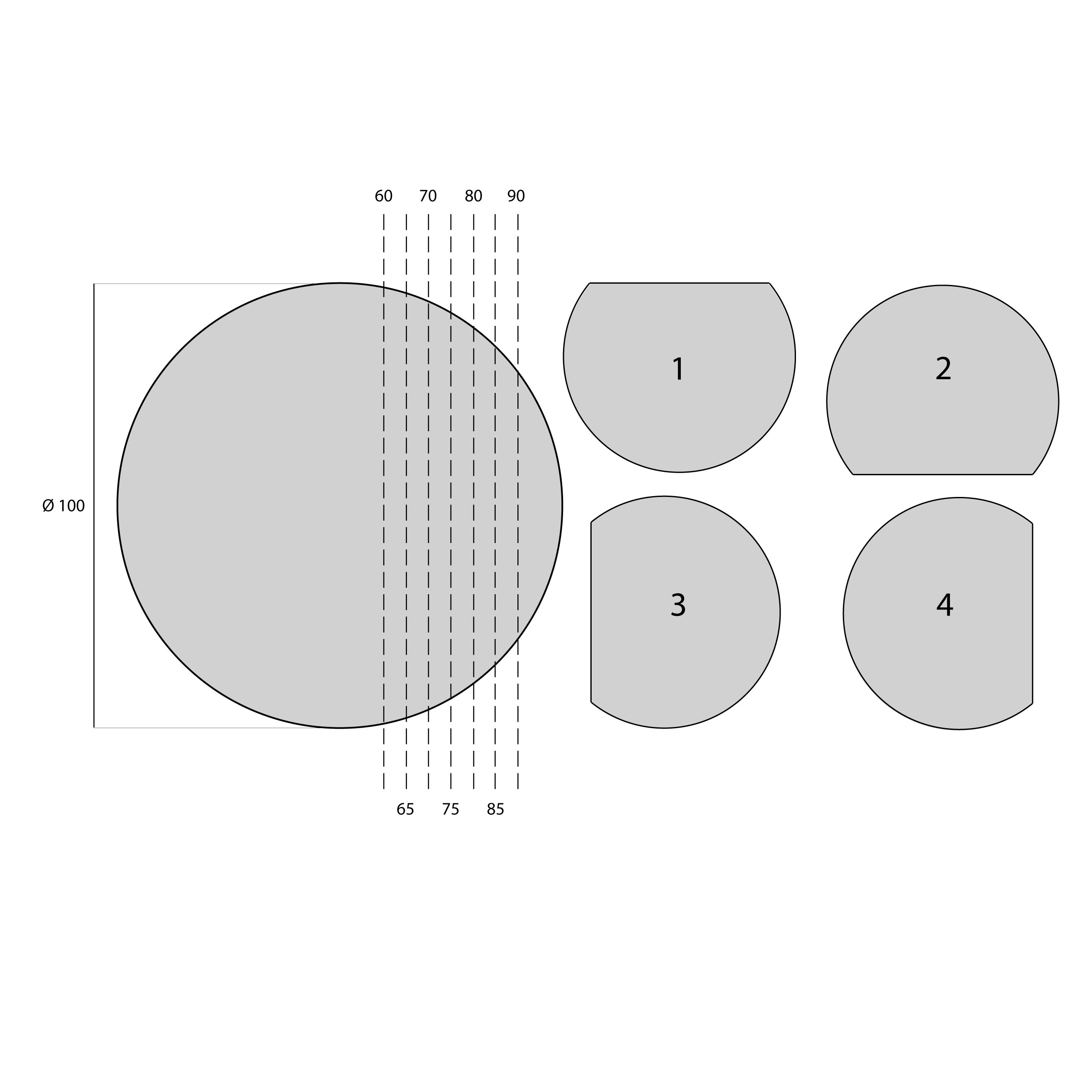 - 100 cm – Średnica, ze ścięciem dostępne rozmiary 100x90cm 100x85cm, 100x80cm, 100x75cm, 100x70cm, 100x65cm, 100x60cm